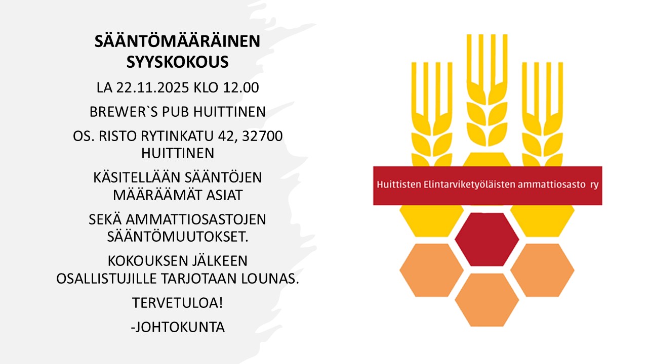 SÄÄNTÖMÄÄRÄINEN SYYSKOKOUS LA 22.11.2025 KLO 12.00 BREWER`S PUB HUITTINEN OS. RISTO RYTINKATU 42, 32700 HUITTINEN KÄSITELLÄÄN SÄÄNTÖJEN MÄÄRÄÄMÄT ASIAT SEKÄ AMMATTIOSASTOJEN SÄÄNTÖMUUTOKSET. KOKOUKSEN JÄLKEEN OSALLISTUJILLE TARJOTAAN LOUNAS. TERVETULOA! -JOHTOKUNTA